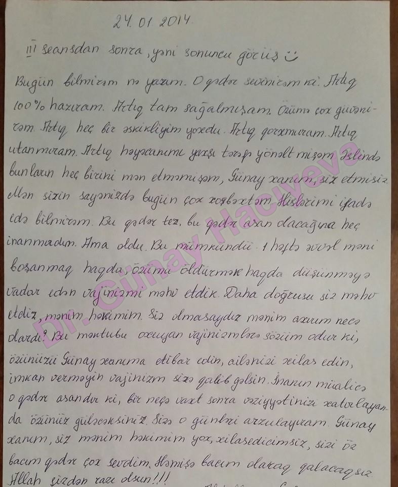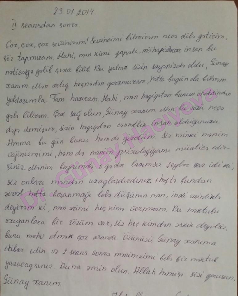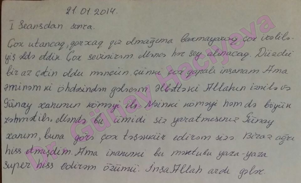 Bu xəstəmiz Lənkərandan müraciət etmişdir. 3 aya yaxın idi ki evlənmişdilər. Amma birlikdə ola bilmirdilər. Müalicəmiz 3 seansa bitdi. Onun müalicə sırasında yazdığı məktubu :